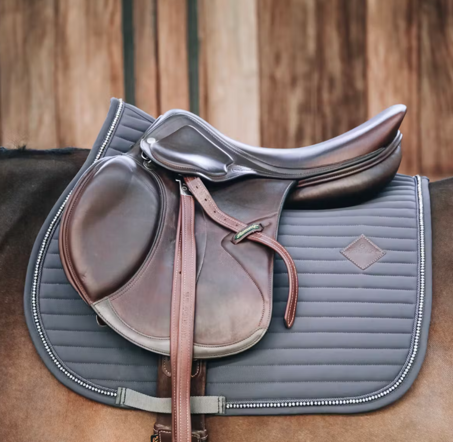 It features a subtle leather logo in the same color as the saddle pad, whilst still offering enough room to embroider it if needed.